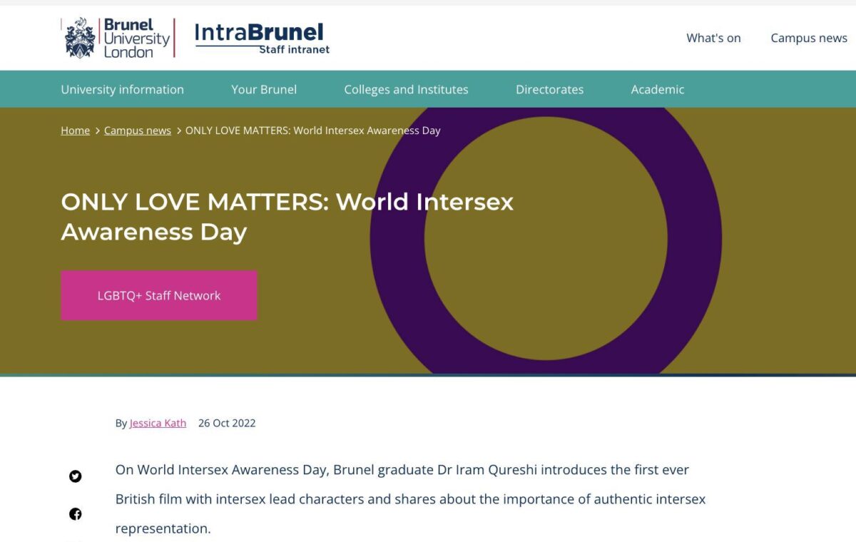 A news article and producer Dr Iram Qureshi’s interview by Jessica Kath (2022), LGBTQ+ Staff Network Coordinator of Brunel University London for her film “ONLY LOVE MATTERS on the World Intersex Awareness Day 2022.