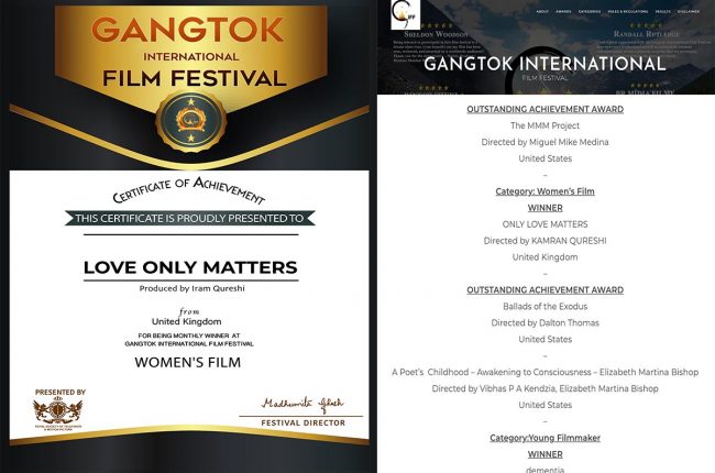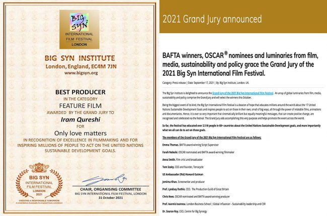 Iram Qureshi is the winner of Best Producer Award and Special Mention Award for Feature Film at Big Syn International Film Festival, London for movie Only Love Matters.