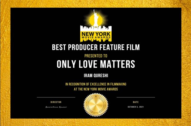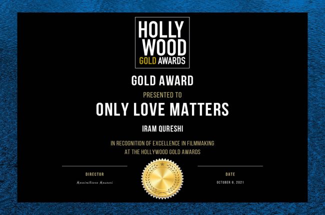 Iram Qureshi's produced recent movie Only Love Matters is the winner of 5 Gold and 2 Silver in Hollywood Gold Awards, Los Angeles, California, United States.
