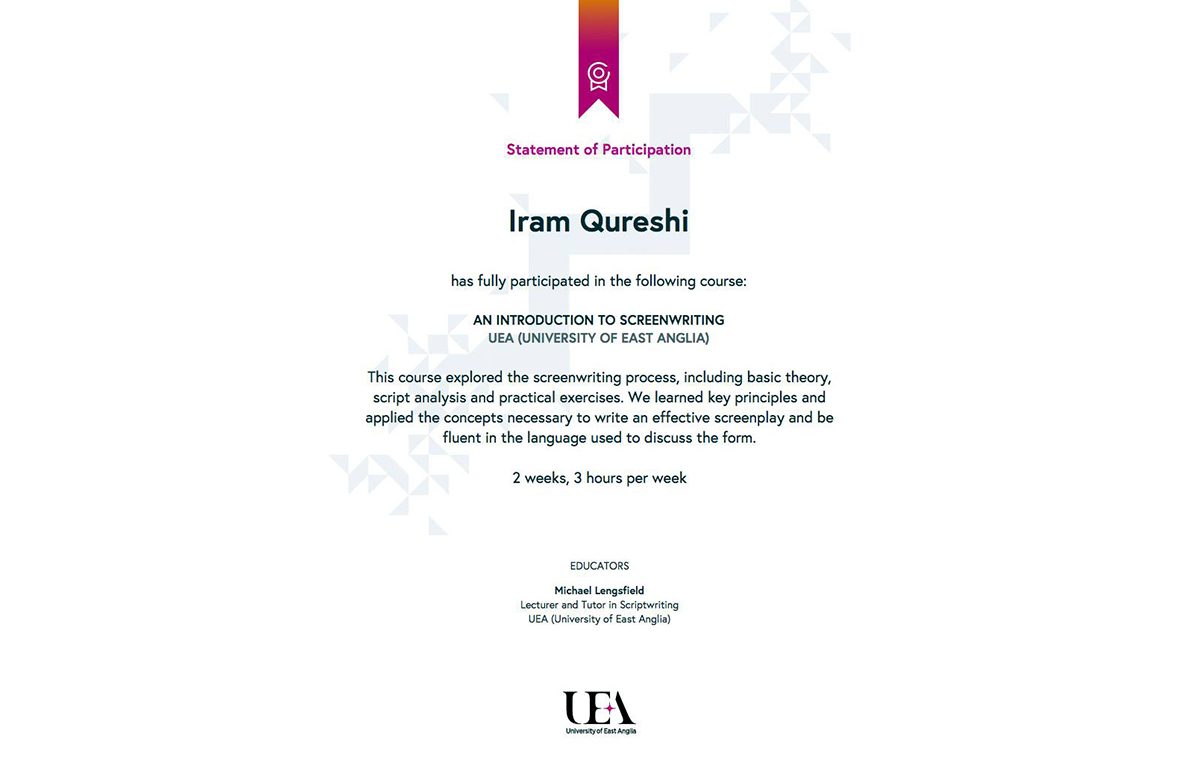 Academia News Screenwriting: University of East Anglia 0 Comment Iram has completed screenwriting course from University of East Anglia, UK.